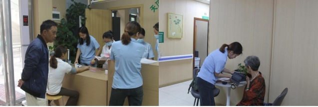 在社区工作人员和志愿者的引导下,居民们有序排队、取号就诊,志愿者们在卫生站就诊引导台为前来就医的社区居民们进行了血压、血糖等常规项目的免费检查,并为高血压、糖尿病患者免费发放了降压、降糖药物。