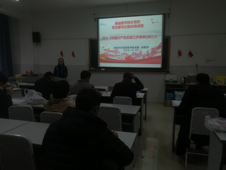 为落实《88直播 关于深化巡视整改工作的推进方案》的有关要求,12月19日,基础医学院党委在后栋352教室开展2018党支部书记强化培训班,学习《中国共产党支部工作条例(试行)》,培训班由基础医学院党委书记黄菊芳授课,党委副书记刘谭明主持。