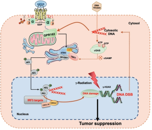 该合作团队首次揭示了G蛋白偶联受体家族中的孤儿受体GPR162可作为一种新型放疗增敏剂,通过与STING相互作用,靶向DNA损伤反应,激活IRF3,加速I型干扰素系统的激活,促进CXCL10和CXCL4等趋化因子的表达,抑制肿瘤的发生和发展,为改善癌症放疗提供了新策略。
