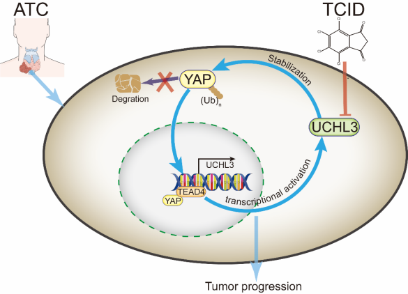 在该研究中,研究者证实了去泛素酶UCHL3去泛素化修饰YAP蛋白,提高其蛋白的稳定性;另一方面YAP入核形成YAP/TEAD4复合物作用于UCHL3启动子区域转录激活UCHL3的表达,从而形成UCHL3/YAP正反馈环路,促进肿瘤进展。使用小分子抑制剂靶向UCHL3可显著抑制肿瘤的生长,为肿瘤新药研发提供了潜在有效的治疗靶点。