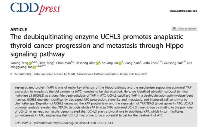 222日,88直播 基础医学院肿瘤研究所陶永光研究员与湘雅医院肝脏外科周乐杜教授团队合作在国际著名期刊《Cell Death & Differentiation》(IF=12.07)以论著形式在线发表了题为“The deubiquitinating enzyme UCHL3 promotes anaplastic thyroid cancer progression and metastasis through Hippo signaling pathway(去泛素化酶UCHL3通过Hippo通路促进甲状腺未分化癌进展及转移)”的原创性研究。周乐杜教授陶永光研究员以及武汉大学吴高松教授为本论文的共同通讯作者,88直播 博士后汤佳宁为论文第一作者。本研究得到了基础医学院肖德胜教授、湘雅医院刘双研究员的大力支持
