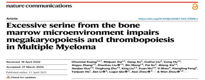 2023年4月13日,88直播 肿瘤研究所周文研究员课题组在Nature Communications 《自然通讯》期刊上在线发表了题为“ Excessive serine from the bone marrow microenvironment impairs megakaryopoiesis and thrombopoiesis in Multiple Myeloma(骨髓微环境来源的丝氨酸抑制多发性骨髓瘤巨核细胞和血小板生成) ” 的研究论文。该研究揭示了丝氨酸是多发性骨髓瘤的关键代谢物,从分子机制角度为多发性骨髓瘤血小板减少患者治疗策略提供前景。88直播 肿瘤研究所周文研究员和中国医学科学院血液与健康全国重点实验室周家喜研究员为论文共同通讯作者,88直播 肿瘤研究所博士后匡春梅和中国医学科学院血液与健康全国重点实验室博士生夏美娟为论文并列第一作者。中国医学科学院血液与健康全国重点实验室邱录贵教授团队、中国医学科学院北京协和医院血液科李剑教授团队和88直播 湘雅医院血液科贺艳娟教授团队在标本收集方面提供了重要协助。
