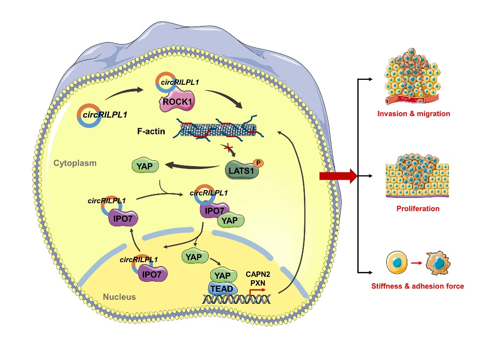 在本研究中,研究者通过分析鼻咽癌转录组数据,首次发现环状RNA分子circRILPL1在鼻咽癌中表达增高,并且与鼻咽癌患者预后不良相关circRILPL1RILPL1基因的第3、4号外显子反向拼接形成。采用细胞和动物模型研究表明circRILPL1高表达显著促进了鼻咽癌细胞在体外、体内的增殖和转移能力。circRILPL1降低了鼻咽癌细胞的粘附能力和细胞膜表面硬度,引起细胞骨架重进一步研究发现circRILPL1是通过结合并激活ROCK1抑制了Hippo信号通路关键激酶LATS1的活性,降低了LATS1催化的YAP蛋白Ser127、Ser397位点的磷酸化水平,从而阻止YAP蛋白降解。另一方面,circRILPL1还可以与核输入受体IPO7蛋白结合,协同促进YAP蛋白转运至细胞核,激活YAP信号通路,增强细胞骨架重塑因子CAPN2PXN的基因转录,导致其表达上调。