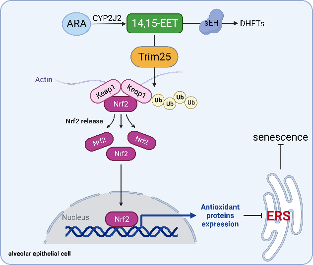 肺泡上皮细胞(AECs)是维持肺功能稳定的重要细胞,也是肺衰老的主要靶细胞。AECs衰老已被认为是多种慢性肺部疾病的关键驱动因素。因此,探讨如何延缓AECs衰老对防治慢性肺部疾病极为重要。管茶香教授团队对花生四烯酸代谢在肺部疾病发生发展中的作用进行了系列研究,前期已发现花生四烯酸经CYP450通路生成的代谢产物环氧二十碳三烯酸(EETs)具有抗肺纤维化作用。该研究探讨了EETs在抗AECs衰老中的作用,发现EETs可通过Trim25增强Keap1泛素化降解,促进Nrf2入核发挥抗氧化作用,进而抑制内质网应激,减轻AECs衰老。该研究创新性提出EETs可能作为一种新型内源性抗衰老物质,为防治年龄相关慢性肺部疾病提供了新思路。该研究是国家自然科学基金衰老领域重大研究计划培育项目的重要成果之一。