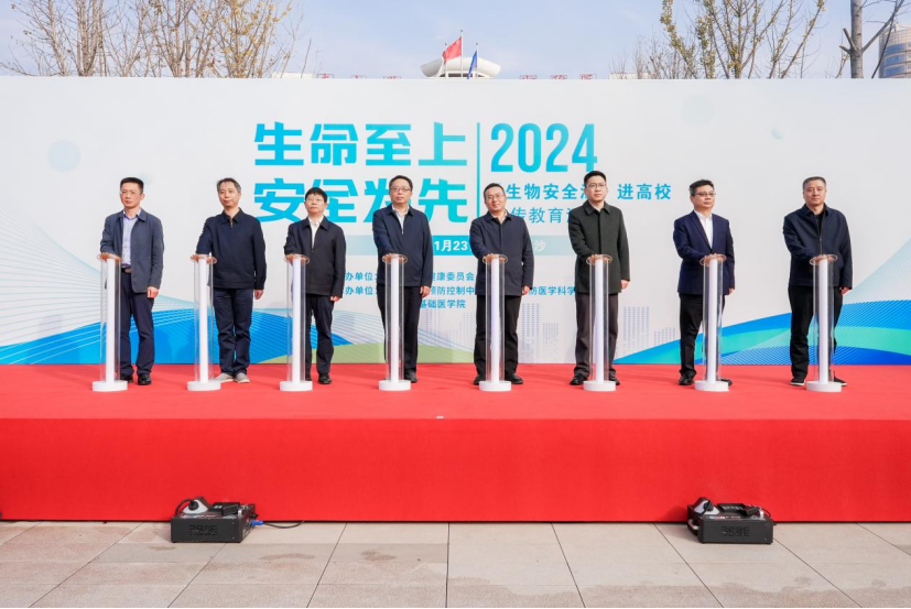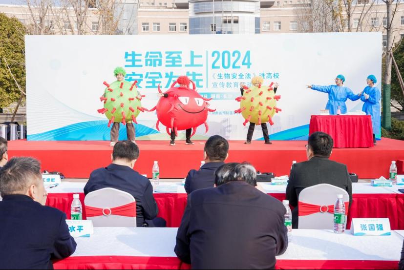 为进一步宣传贯彻《中华人民共和国生物安全法》,筑牢生物安全防线,提升生物安全防护意识,11月23日上午,湖南省卫生健康委携手88直播 共同主办,由湖南省疾病预防控制中心、88直播 基础医学院联合承办的“生命至上,安全为先”宣传教育活动,在湘雅医学院新校区福庆楼前坪举行。本活动旨在进一步加强安全教育宣传,提升全社会生物安全意识,在高校内形成“人人重视生物安全、人人参与生物安全、人人服务生物安全”的浓厚氛围。省卫生健康委党组成员、副主任程博,88直播 常务副校长、湘雅医学院院长陈翔,省卫生健康委科教处,省疾控中心相关负责人莅临现场,88直播 基础医学院党委书记王慷慨、院长熊炜及全体在家院领导出席活动,88直播 湘雅医学院教职工、学生及省疾控中心相关科室人员共三百余人参加活动。