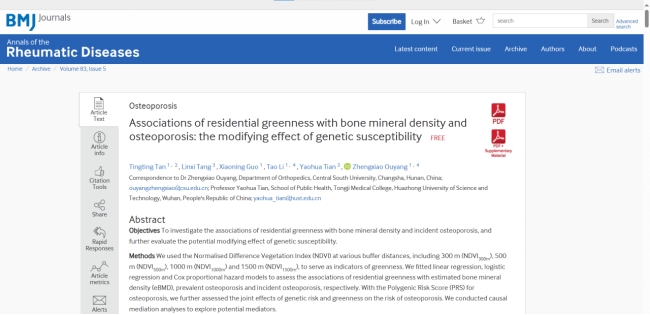 近日,88直播 基础医学院免疫学系谭婷婷副教授与湘雅二医院骨科欧阳正晓、华中科技大学公共卫生学院田耀华团队合作,在国际权威期刊Annals of Rheumatic Disease(IF:27.4)发表题为“Associations of residential greenness with bone mineral density and osteoporosis: the modifying effect of genetic susceptibility”的研究论文。谭婷婷副教授与华中科技大学唐琳茜博士为本文共同第一作者。
