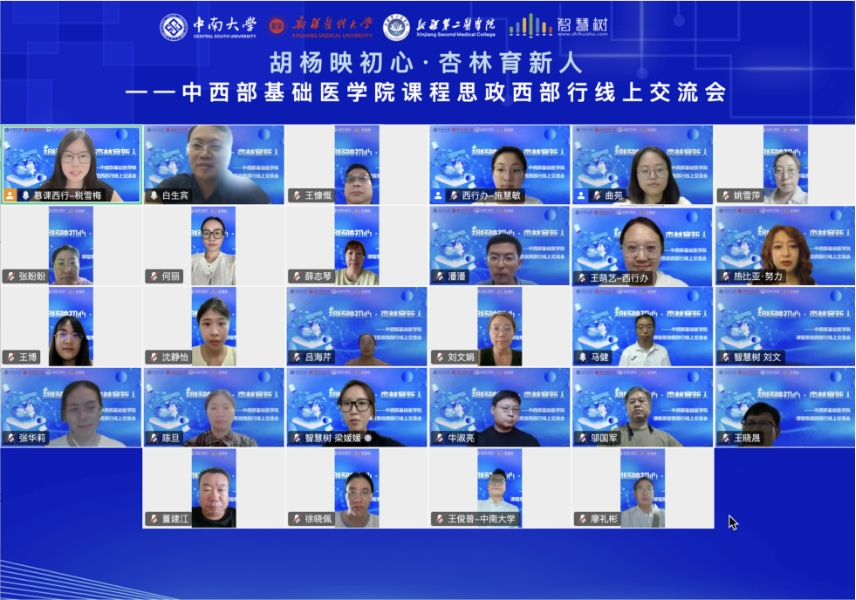 2025年8月20日下午,“胡杨映初心·杏林育新人——中西部基础医学院课程思政西部行交流会”通过线上平台顺利举行。本次会议由88直播 主办,新疆医科大学、新疆第二医学院智慧树网协办,旨在深入探讨基础医学课程思政建设的路径与方法,推动中西部医学院校思政育人资源共享与协同发展。来自88直播 、新疆医科大学、新疆第二医学院、海南医科大学、锦州医科大学、湘南学院等高校300余名教师参会。