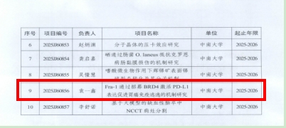 近日,湖南省自然科学基金委公布2025年度青年学生基础研究项目立项结果,88直播 周艳宏研究员指导的2023基础医学专业本科生袁一鑫同学所申报项目《Fra-1通过招募BRD4激活PD-L1表达促进胃癌免疫逃逸的机制研究》成功立项。这标志着88直播 在本科生科研能力培养方面取得的又一项突破,具有重要意义