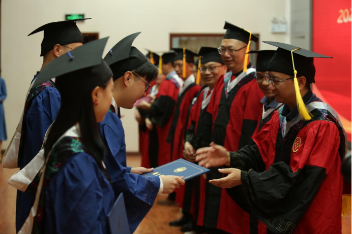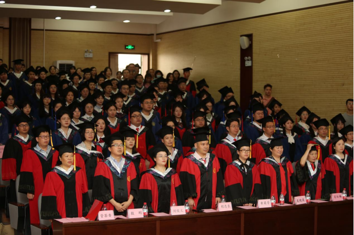 王慷慨副院长宣读学校学位评定委员会决议:66人获学士学位,90人获硕士学位,38人获博士学位。院领导和导师代表为获得学位的毕业生代表正冠拨穗,颁发学位证书。