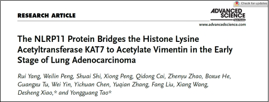 近日,88直播 基础医学院陶永光/肖德胜教授团队在国际期刊Advanced Science(IF=15.1)发表题为The NLRP11 protein bridges the histone lysine acetyltransferase KAT7 to acetylate vimentin in the early stage of lung adenocarcinoma的原创性研究论文,陶永光教授、肖德胜教授为该文的共同通讯作者,88直播 博士研究生杨瑞为第一作者。