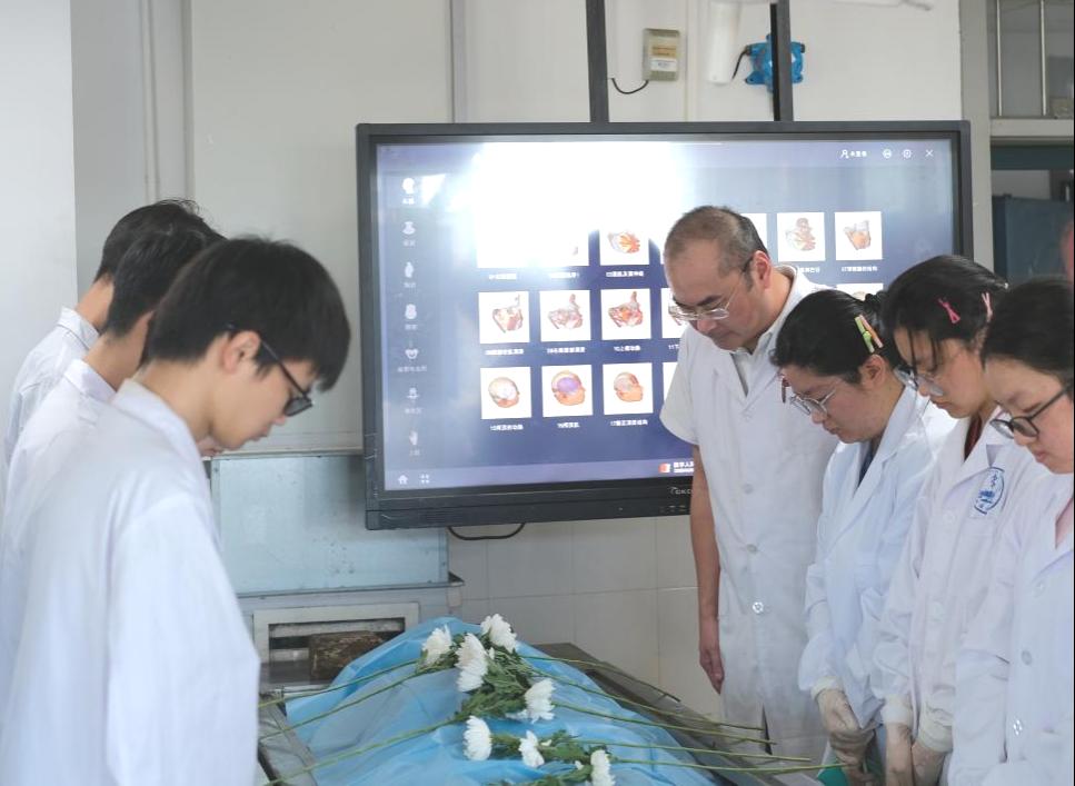 简朴而隆重的《局部解剖学》开课仪式最后,全体学生手持白色菊花,在老师的带领下回到实验室,向“大体老师”鞠躬默哀1分钟并献花,以表缅怀与感恩之情。湘雅医学院的学生将以解剖学知识为翼,乘解剖求真之风,青云直上,抟扶十万里去,带着“大体老师”的大爱,为将来除人类之病痛、助健康之完美、开医学之新元不断积蓄力量!