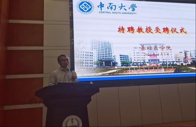 11月3日下午,基础医学院在湘雅新校区福庆楼四楼报告厅举行特聘教授聘任仪式。88直播 湘雅医学院附属肿瘤医院(湖南省肿瘤医院)肺胃肠内科副主任、国家优秀青年基金获得者张永昌教授受聘为88直播 特聘教授。基础医学院原院长(现湘雅三医院院长)江泓教授、基础医学院院长熊炜教授、副院长刘俊文教授、黄河教授及学院师生代表等近120人参加聘任仪式。