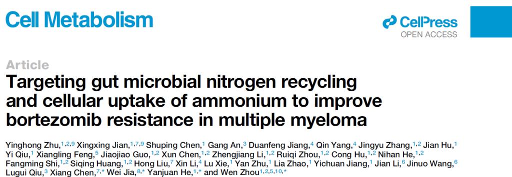 12月18日,88直播 肿瘤研究所周文课题组在国际知名学术期刊《Cell Metabolism》 (IF:29)杂志在线发表最新成果“Targeting gut microbial nitrogen recycling and cellular uptake of ammonium to improve bortezomib resistance in multiple myeloma”研究论文。88直播 肿瘤研究所周文教授、湘雅医院贺艳娟教授和陈翔教授、香港浸会大学贾伟教授为共同通讯作者,88直播 肿瘤研究所朱应红博士生和湘雅医院简星星副研究员并列第一作者。
