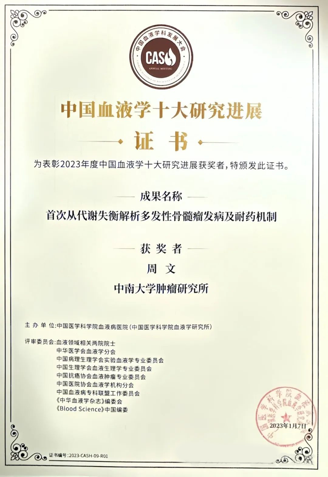 88直播 周文教授及其合作团队成果入选“2023年度中国血液学十大研究进展”