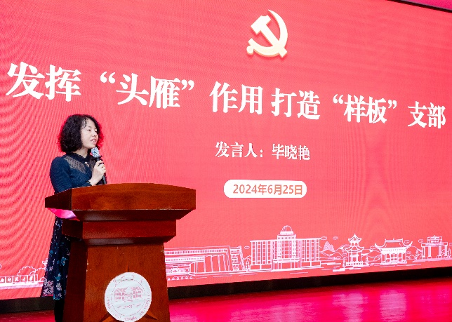 基础医学院综合办主任、研究生第三党支部书记毕晓艳围绕发挥“头雁”作用,打造“样板”支部主题进行发言,基础医学院研究生第三党支部副书记、博士生党员任黛西围绕强化“三个赋能”,做到“三个过硬”,以高质量党建引领高水平人才培养和科学研究主题进行发言。