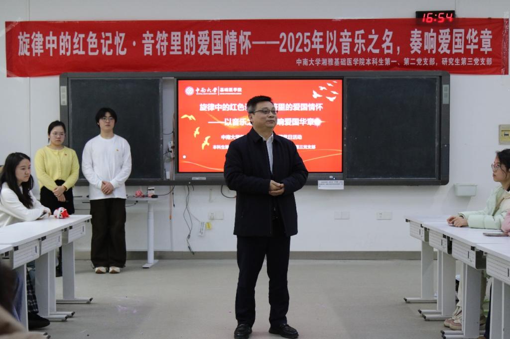2025年1月8日,88直播 湘雅基础医学院研究生第三党支部联合学院本科生第一、第二党支部开展以 “旋律中的红色记忆·音符里的爱国情怀——2025以音乐之名,奏响爱国华章” 为主题的党日活动。院党委书记王慷慨教授,研究生第三党支部书记毕晓艳老师,本科生支部周正和刘莹莹老师参加活动。