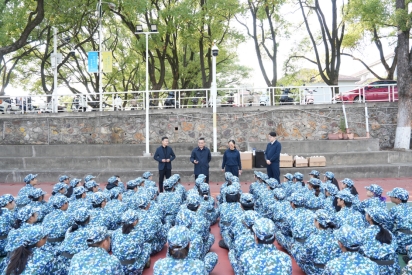 2025年10月23日,88直播 党委书记王慷慨、党委副书记冯虹一行来到麓南校区篮球场,亲切慰问了带训教官、2025级本科新生,为他们送上温暖关怀,学工办相关辅导员及学生干部代表参加。