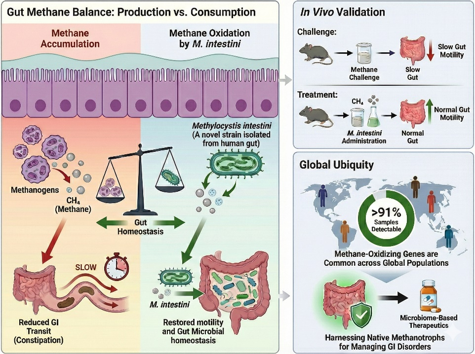 甲烷是人类肠道气体的重要组成部分,已有研究表明肠道中甲烷水平升高与肠道蠕动减慢密切相关。然而,关于肠道内是否存在能够消耗甲烷的微生物—甲烷氧化菌及其对肠道蠕动的调节作用,至今尚无相关的研究。本研究首次从人体肠道样本中分离获得了一株新型肠道甲烷氧化菌——Methylocystis intestini,并系统性地证明了该菌在维持肠道功能中的重要作用,这一全新发现具有重大原创性和科学价值。