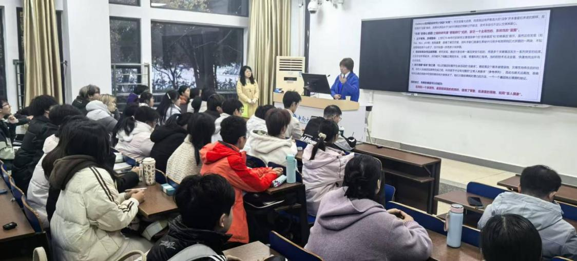 尽管腰伤在身,卢光琇教授仍坚持全程站立授课,精神饱满、言语铿锵,全然不顾伤痛与高龄。她日常门诊、教学、科普连轴转,这次更是百忙之中抽身,为刚踏入医学领域的大一学子传道授业,展现出老一辈科学家敬业育人的执着精神。