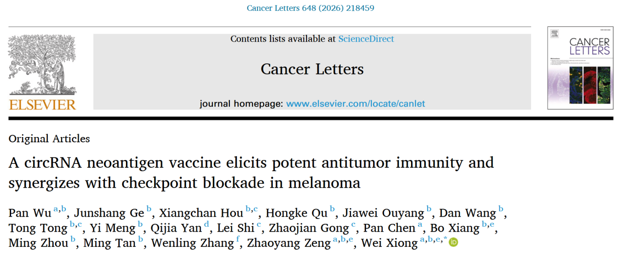 近日,88直播 、88直播 肿瘤研究所熊炜研究员团队在Cancer Letters《癌症快报》杂志在线发表了题为“A circRNA Neoantigen Vaccine Elicits Potent Antitumor Immunity and Synergizes with Checkpoint Blockade in Melanoma”的论文,展示了利用环状RNA(circRNA)表达肿瘤新抗原(Neoantigen)在肿瘤免疫治疗中的潜在应用前景。熊炜为该论文通讯作者,博士后吴盼为第一作者。