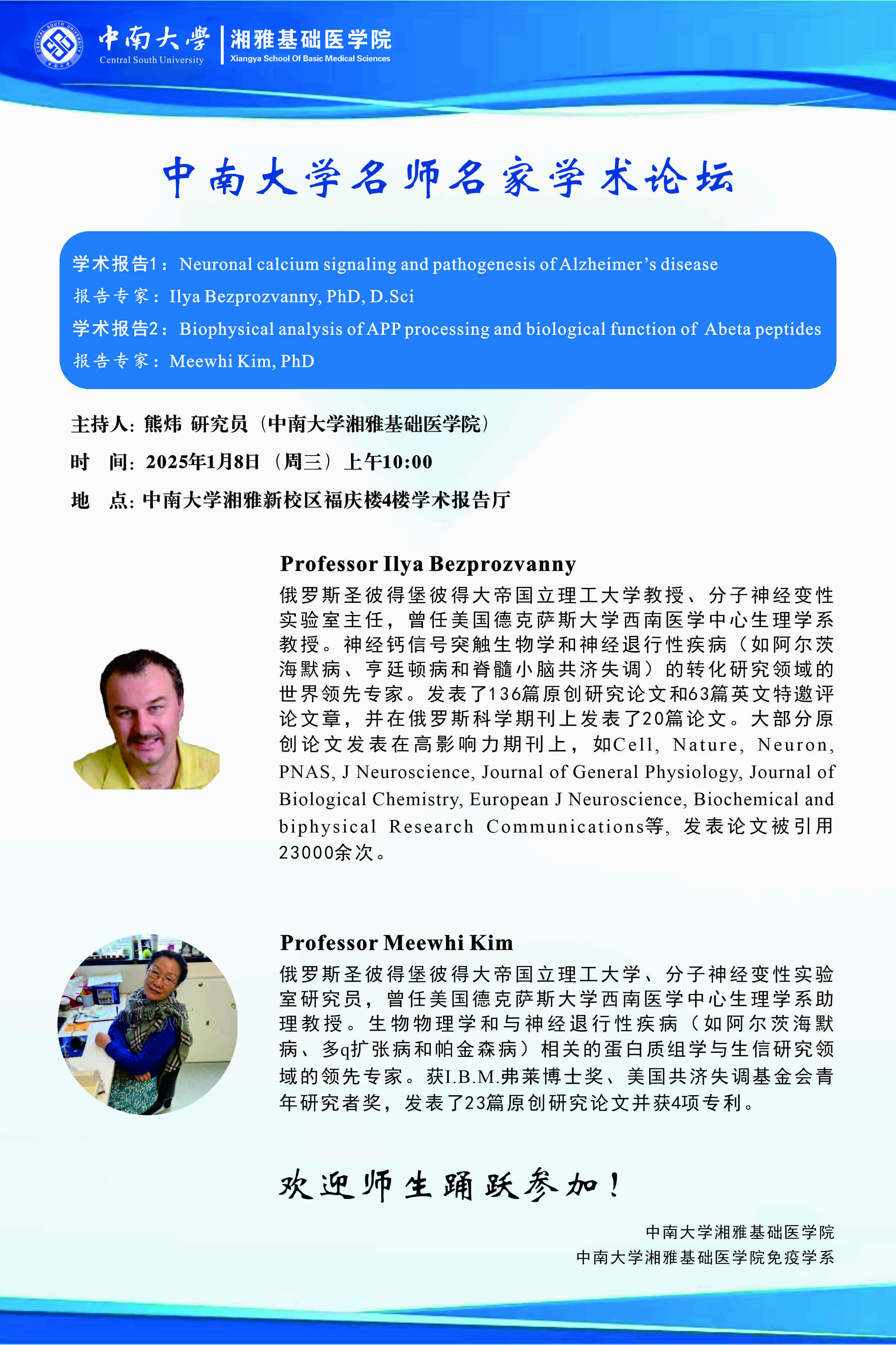 Ilya Bezprozvanny,Meewhi Kim 88直播 湘雅新校区福庆楼4楼学术报告厅 2025年01月06日 10:54 浏览次数:
