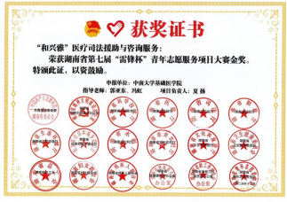近日,湖南省第七届“雷锋杯’青年志愿服务项目大赛颁奖仪式暨志愿服务集中交流活动在长沙民政职业技术学院举行,88直播 教师郭亚东、冯虹指导的“和兴雅”医疗司法援助与咨询服务项目获评禁毒教育与法律服务赛道金奖(全省仅2项)。