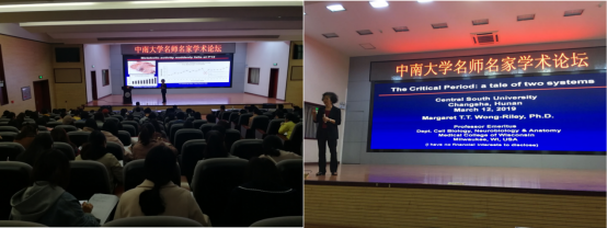 2019年3月12日,美国威斯康星医学院Margaret T.T. Wong-Riley教授做客88直播 基础医学院举办的88直播 名师名家学术论坛,为88直播 师生带来精彩的学术报告。报告会在湘雅医学院新校区图书馆学术报告厅举行,由曾在Wong Riley实验室访问学习过的国家级教学名师罗学港教授主持。