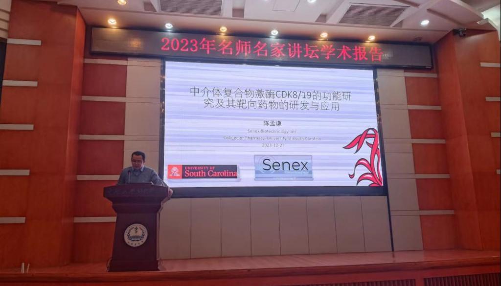 12月27日下午,88直播 生殖与干细胞工程研究所邀请了美国南卡罗来纳大学药学院助理教授、Senex生物技术公司研发总监陈孟谦教授来院做题为“中介体复合物激酶 CDK8/19 的功能研究及其靶向药物的研发与应用”的学术报告。学院党委王慷慨书记、黄河副院长、生干所范立青研究员出席,院内外100余名师生代表参加活动。会议由中生干所副所长孙懿主持。